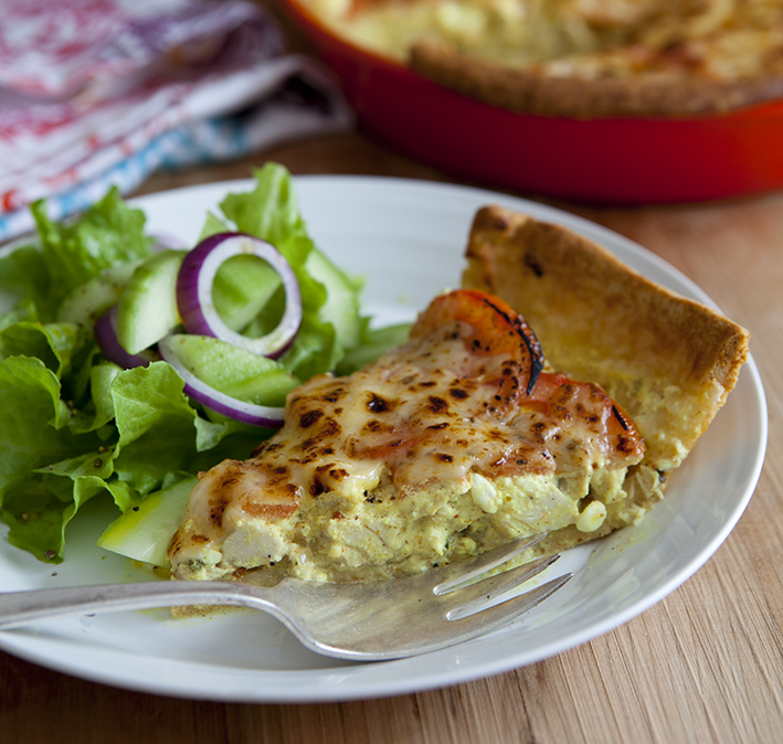 Strö riven ost över och grädda i 20-30 min, 200°C, tills pajen fått en gyllenbrun färg.